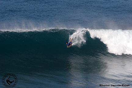 With sets that now seemed to come one after another, the high scores continued into Heat Three; Brazilian, Paulo Barcellos stalled on a seven-footer to get a heaving barrel which looked to be one of the biggest of the day, then hit the closeout end section to finish with a roll. Michael Novey took off on sick one and got covered for nearly seven seconds before coming out and hitting a solid rollo, a wave the judges scored a 9.5.