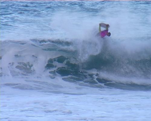 Ian Kruger (Cape Town) was the standout in the first few heats when he completed a risky air-roll-spin manoeuvre. Vaughn Harris (Tsitsikamma) was equally eager to please the judges when he went for a gut wrenching reverse spin off the lip of a wave.