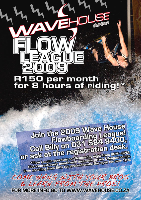 The Wave House Flow League 2009 begins on Wednesday, February 4th. The League is for all riders, New or Old, Advanced or Beginner ... The Divisions we have will vary from Beginner - Intermediate - Professional. Strapless or Strapped. Bodyboarding or Stand-up. The Flow league is going to be fun and is something NEW that we have come up with. It is a start to a long awaited goal of ours at Wave House - Durban, to have a South African Flow Series and here it is.